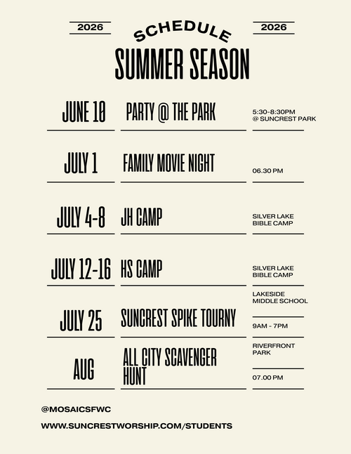 1. Suncrest YA - If you are staying local, we'd love for you to join our Young Adults gathering focused on biblical study and community.