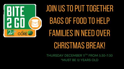 We would love for you to join us as we serve the community! We are teaming up with our local strategic partner - the Bite 2 Go program - to help put together bags of food that will go to families in need over Christmas break!